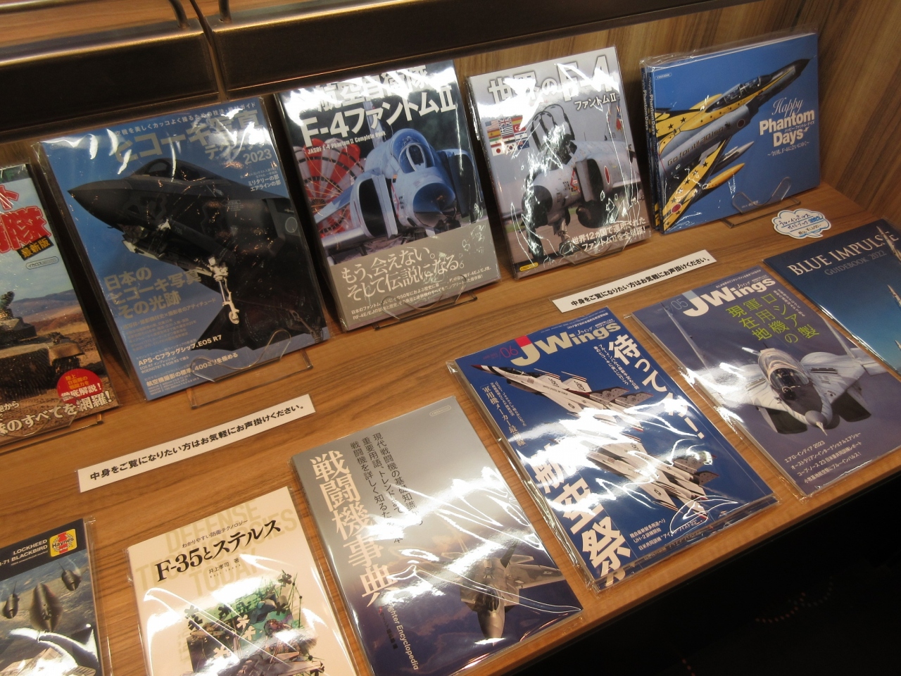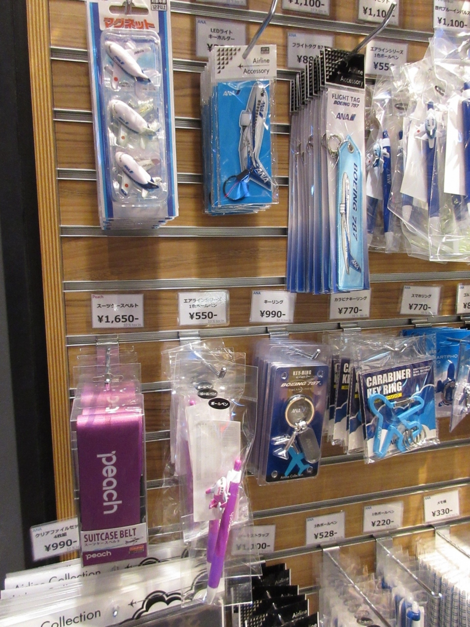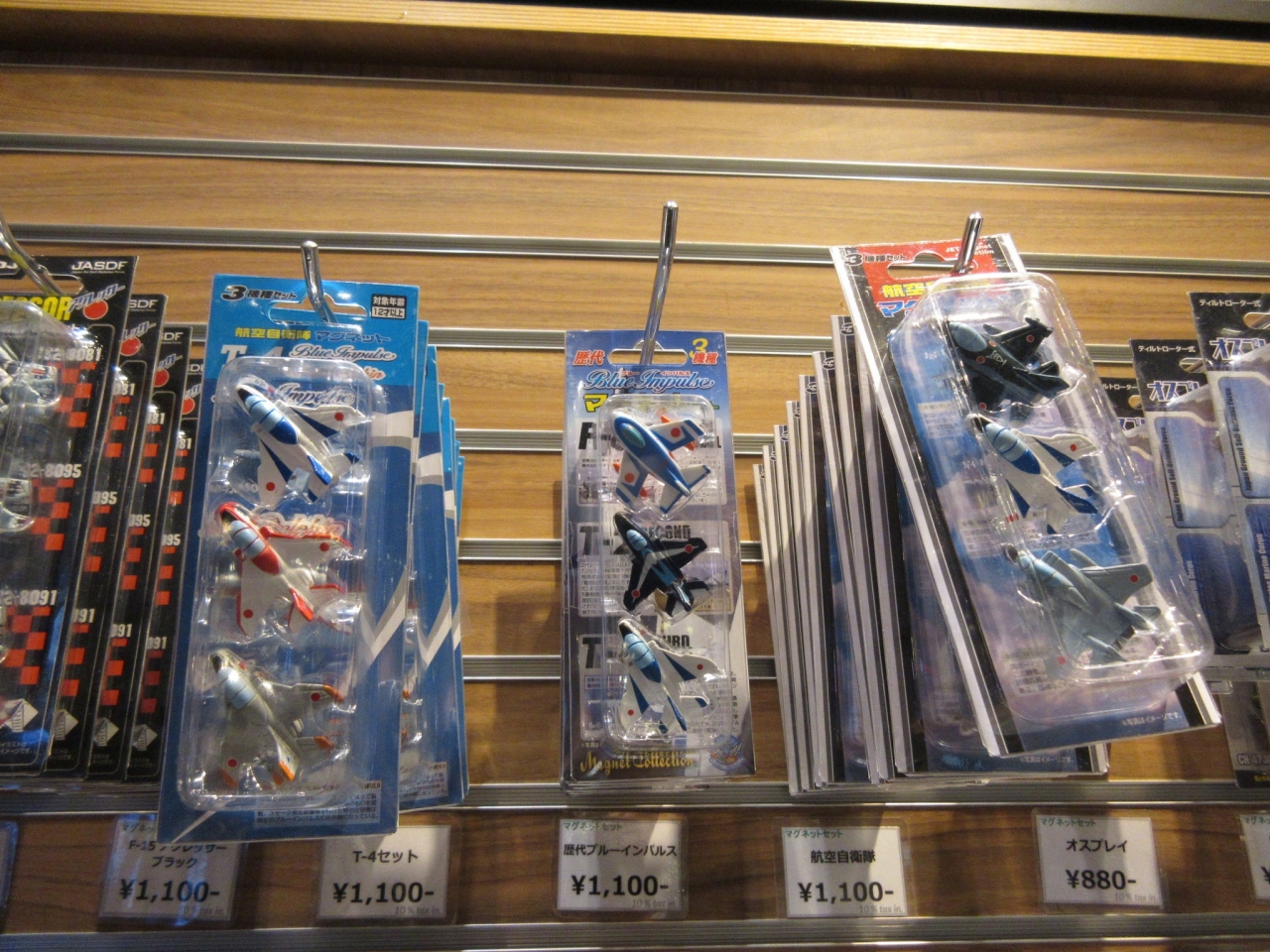 JAL、ANA、ピーチなど、各航空会社のキーホルダーや、ブルーインパルスの関連グッズも豊富に陳列。