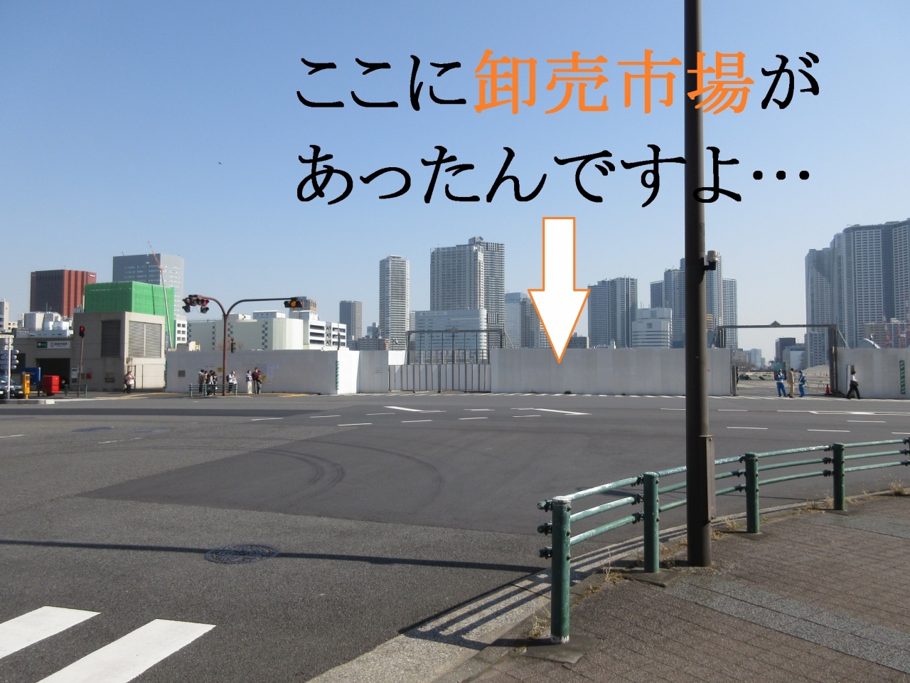 かつて築地市場があった場所は 現在「空き地」となっているため、市場通りの突き当りからは、さらに奥の「勝どき」「晴海」の高層ビル群が見えました。