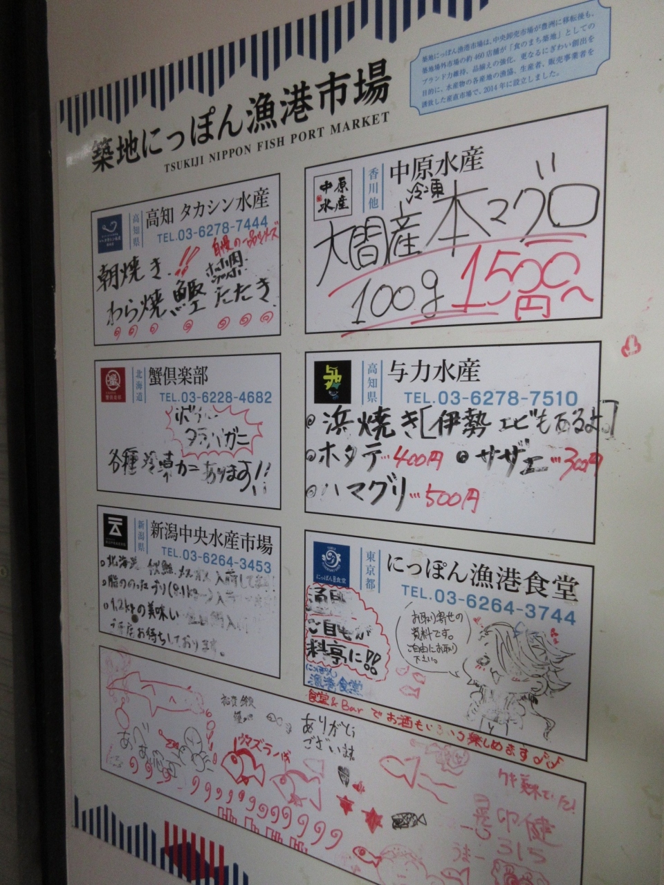 一般客向けに 築地場外の新鮮な魚を販売しているほか、観光案内所もあり、とにかく外国人観光客で 大混雑していました。