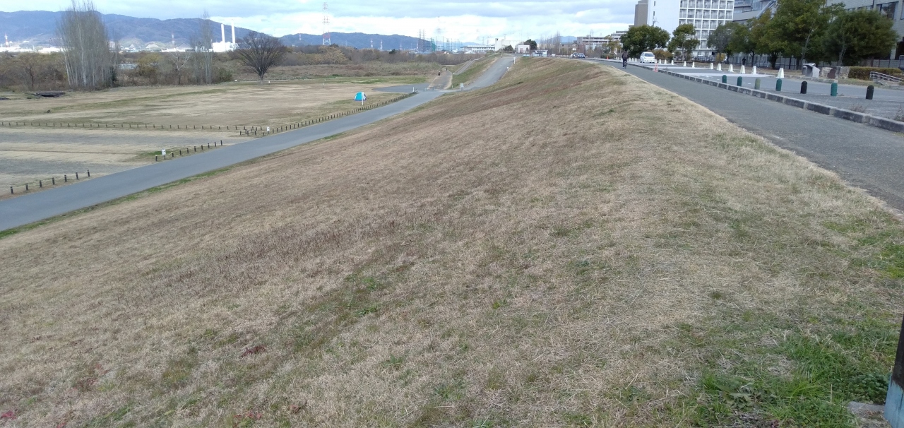 京阪電車・枚方駅から枚方公園駅(ひらぱー)の北側、淀川の南側に広がる 土手沿いの芝生の公園です。