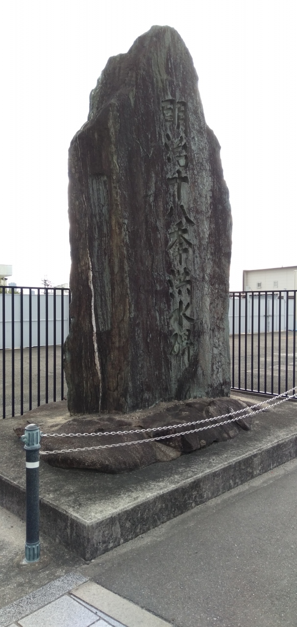 京阪電車・枚方公園(ひらぱー)駅から北西側へ歩くこと3~4分。淀川の河川敷に出る直前の広い道沿いに、とにかくデカい石碑、いや「巨石」が置かれていました。「明治十八季淀川洪水碑」と刻まれた巨石。読んで字のごとく、明治の大洪水を忘れないよう設置されたんですね。