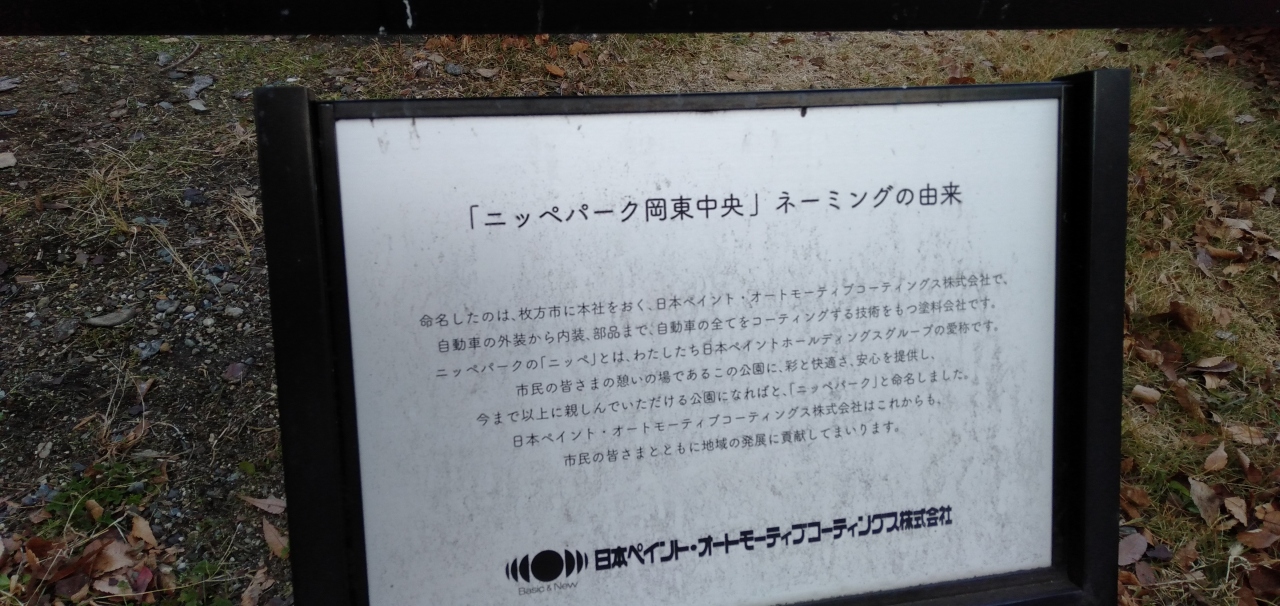 いま流行りの「ネーミングライツ」ではないでしょうが、この公園には日本ペイント社が由来の「ニッペパーク岡東中央」という名前が付いているようです。