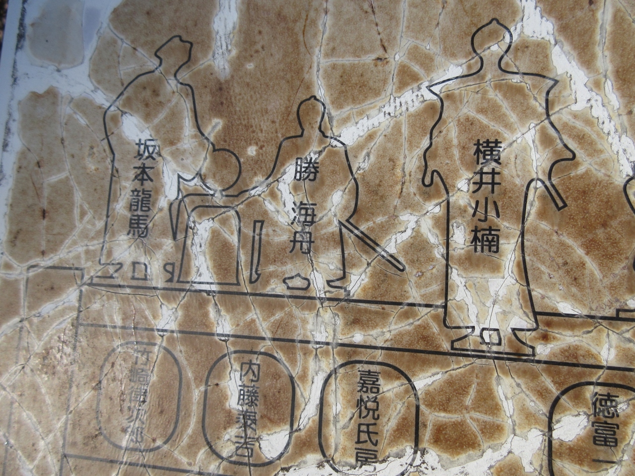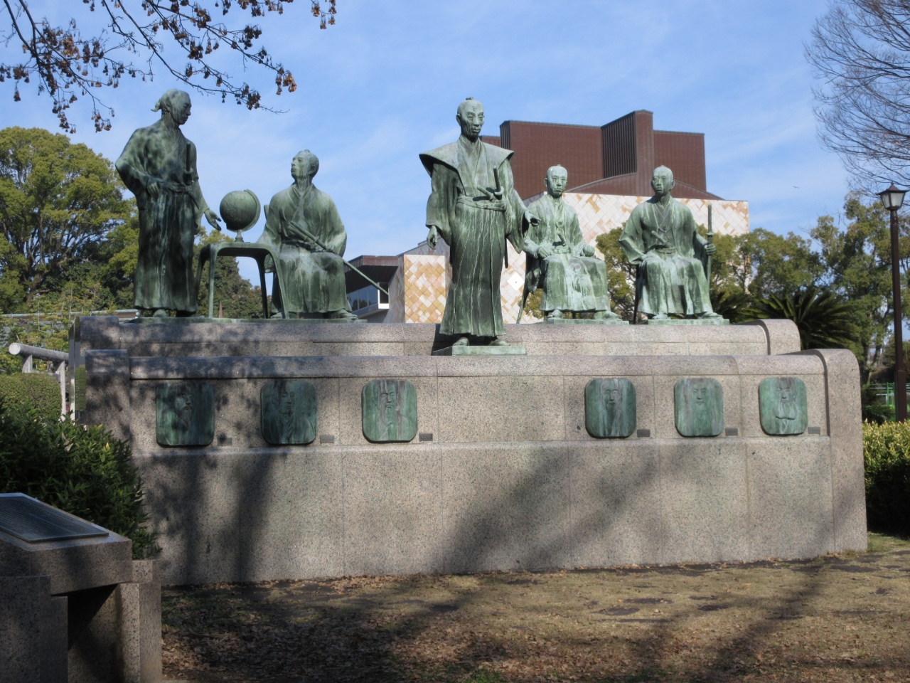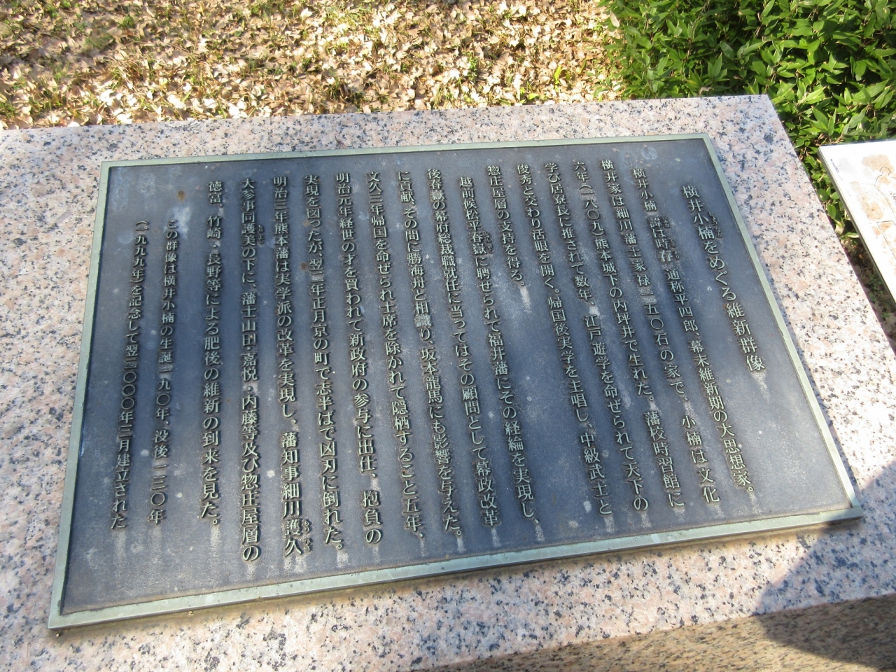 左側に位置する 勝海舟、坂本龍馬は もちろん知っているのですが、中心に立つ「横井小楠」という人物は存じ上げず…。設置されていたレリーフによると、幕末維新期の「大思想家」だそうです。勉強不足で、申し訳ない。- 旅行時期