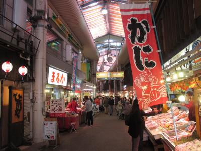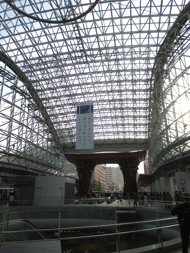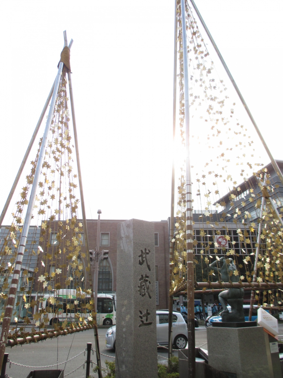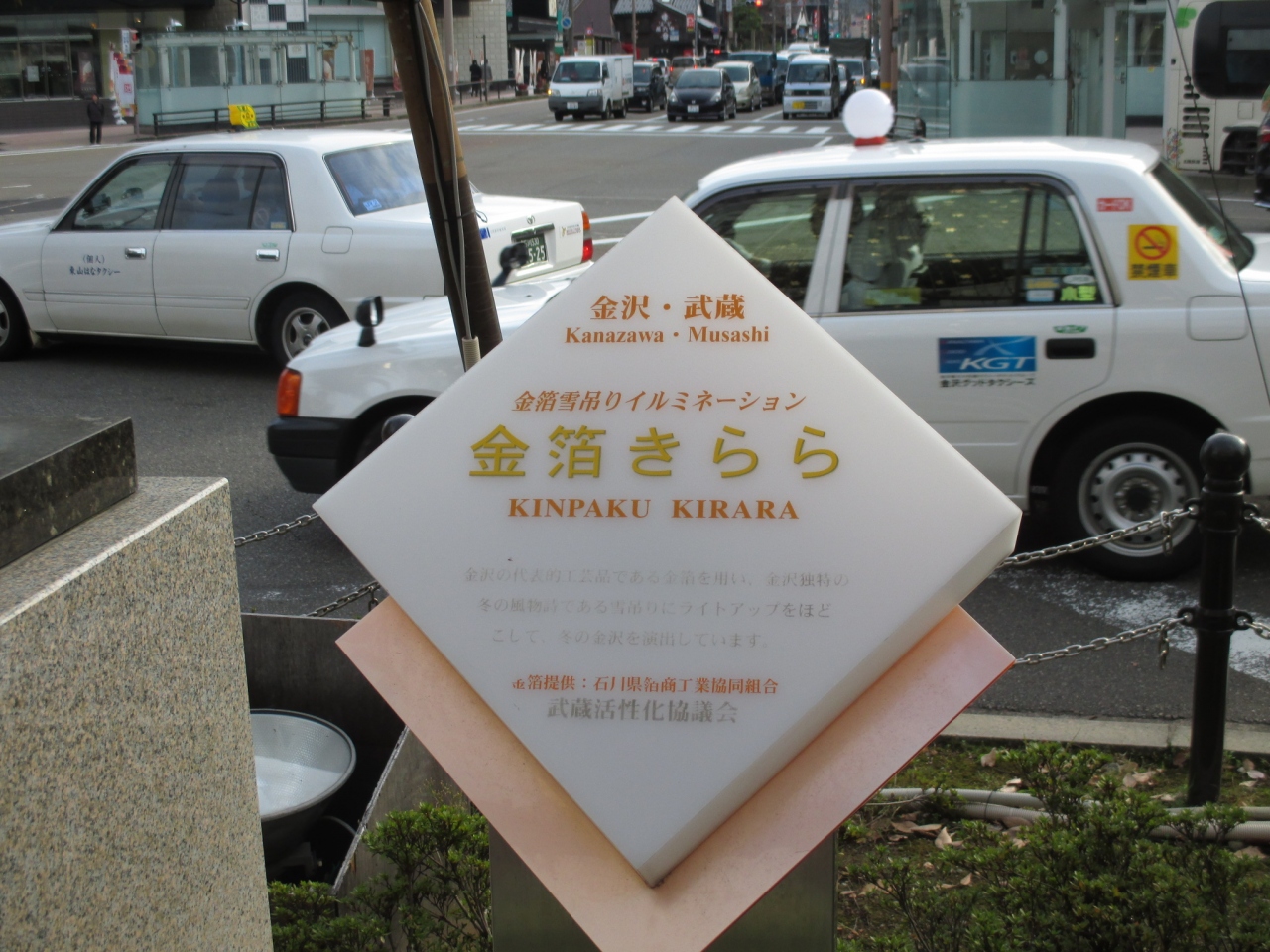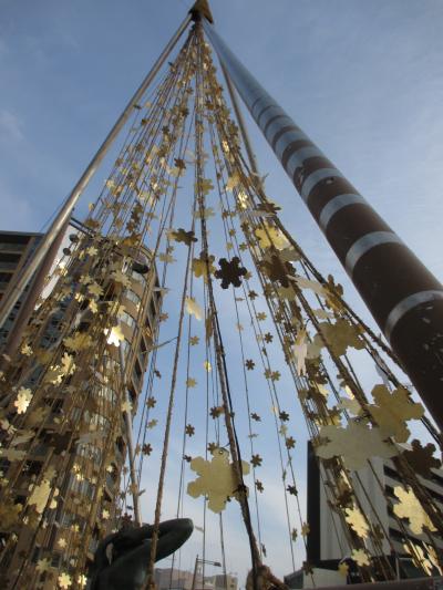 JR金沢駅から近江町市場方面に向かう途中、「武蔵辻」に、きらきら光った装飾が目につきます。これが「金箔雪吊り&ツリーファンタジー」、正式名称は「金箔きらら」といい、冬の金沢で見られる「雪吊り」を表現したイルミネーション。