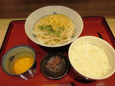 朝セットは、さぬきうどん、白ごはん、それに、選べる一品(生たまご、天ぷら、お揚げなど)がついて、350円とお得な値段。
