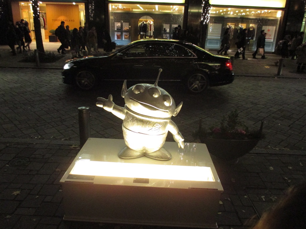 青色LEDの光がきらめく中、今年はディズニーキャラクターが配置され、多くの方々が足を止め、記念撮影をしていました。