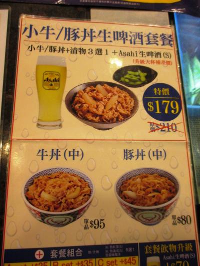 日本と同じく24時間営業で、値段も牛丼95元(285円)、豚丼80元(240円)と日本とほぼ同じくらいですが、唐揚げ、ポテトフライ、イカリングなど、居酒屋メニューがあるのは台湾オリジナル。