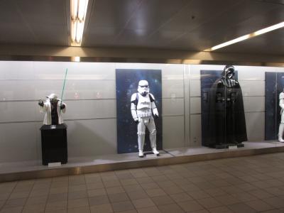 スター・ウォーズ最新作の公開を来年に控え、等身大のフィギュアや、ポスター、写真パネルなどが展示中。