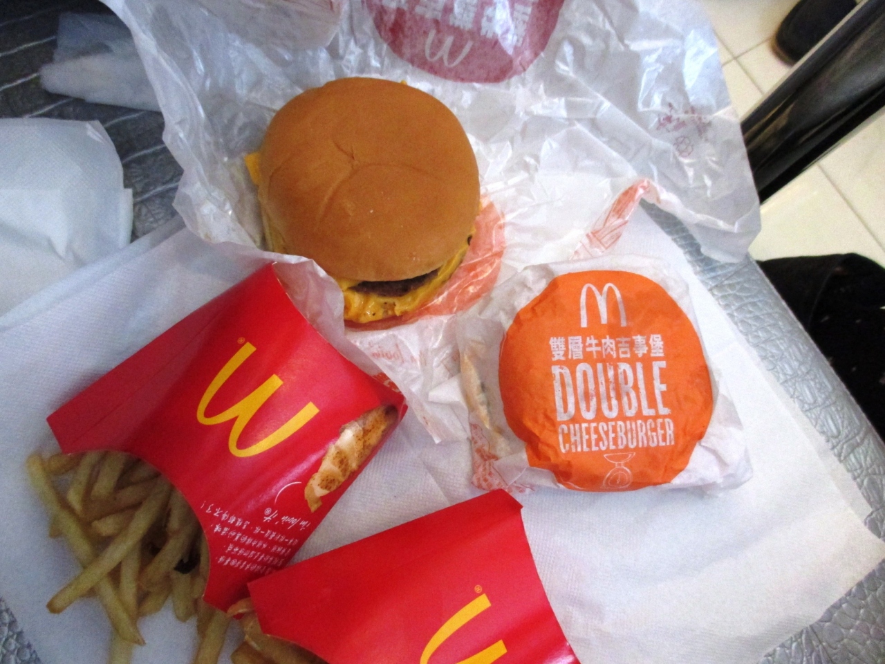 「ダブルチーズバーガー・セット」をテイクアウトで注文しましたが、ドリンクが尋常じゃなく大きく、飲むのに苦労しました。- 旅行時期