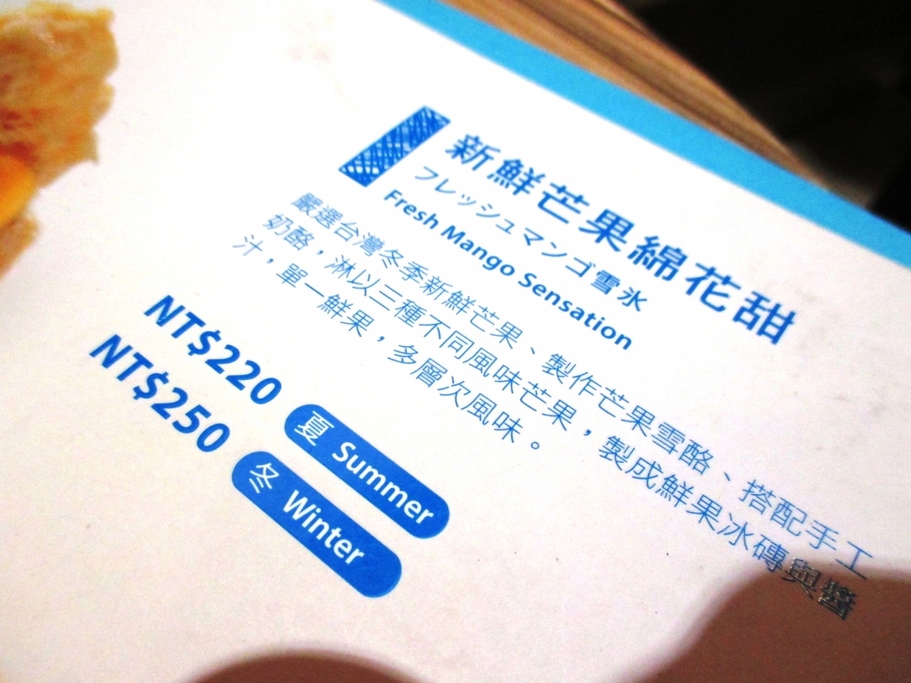 メニューには「フレッシュマンゴ雪氷」と表記されています。