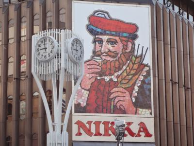 黒っぽい重厚な店構えに、白と青の看板が映えます。