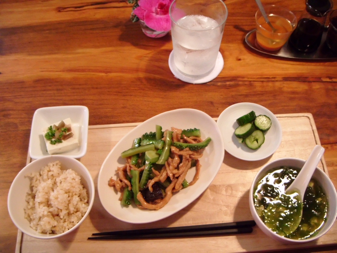 玄米、おかず、スープ、漬物、小鉢、デザート