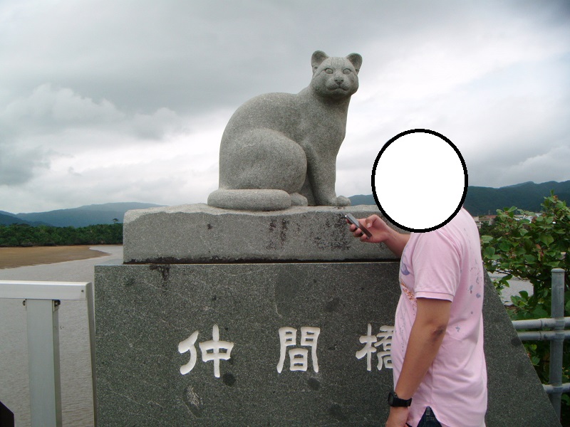 橋の欄干に設置された、石造りのイリオモテヤマネコを