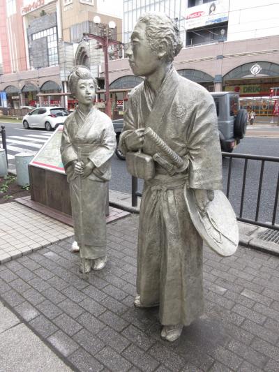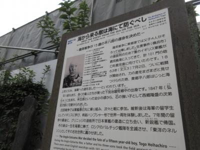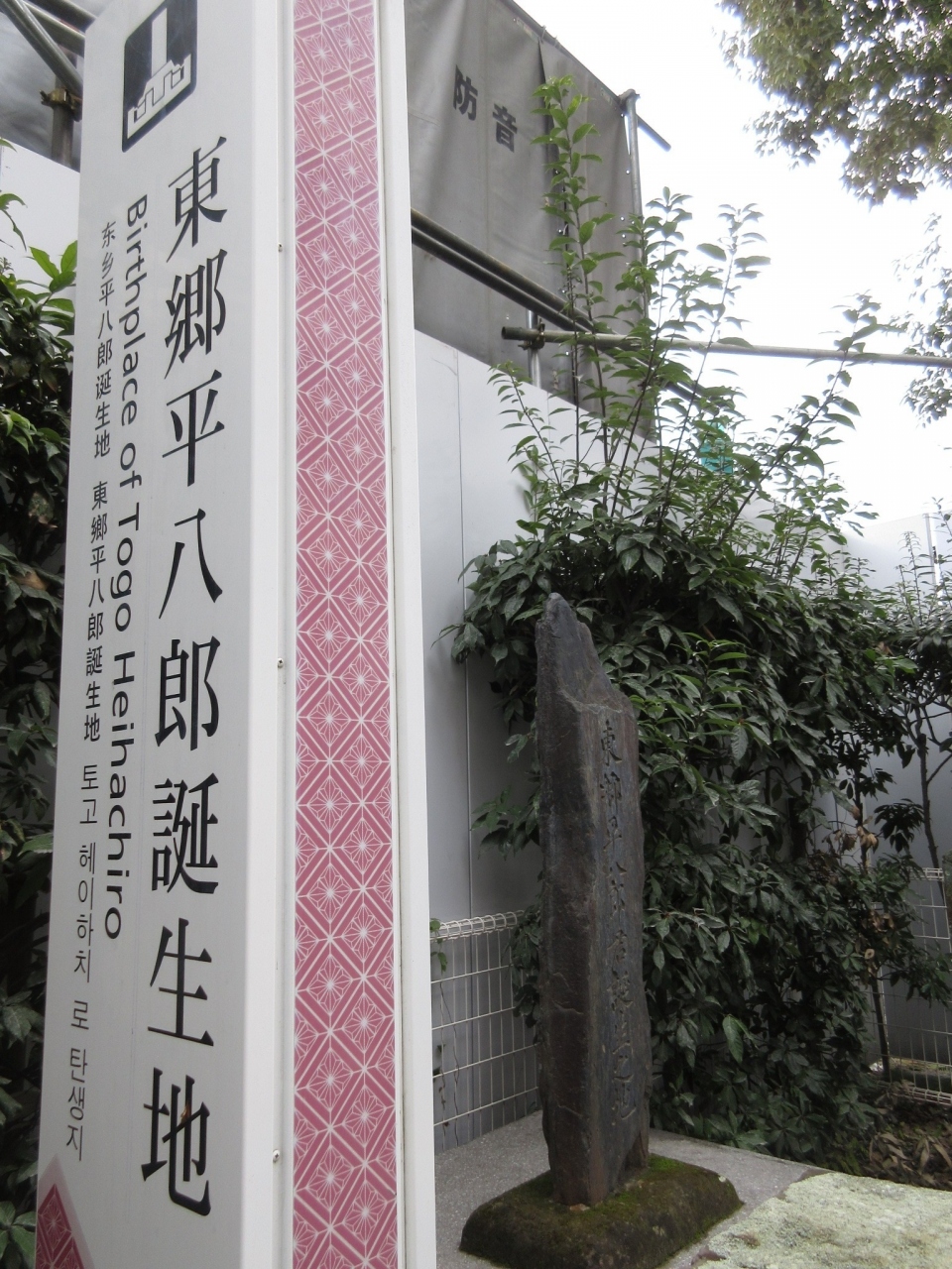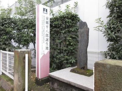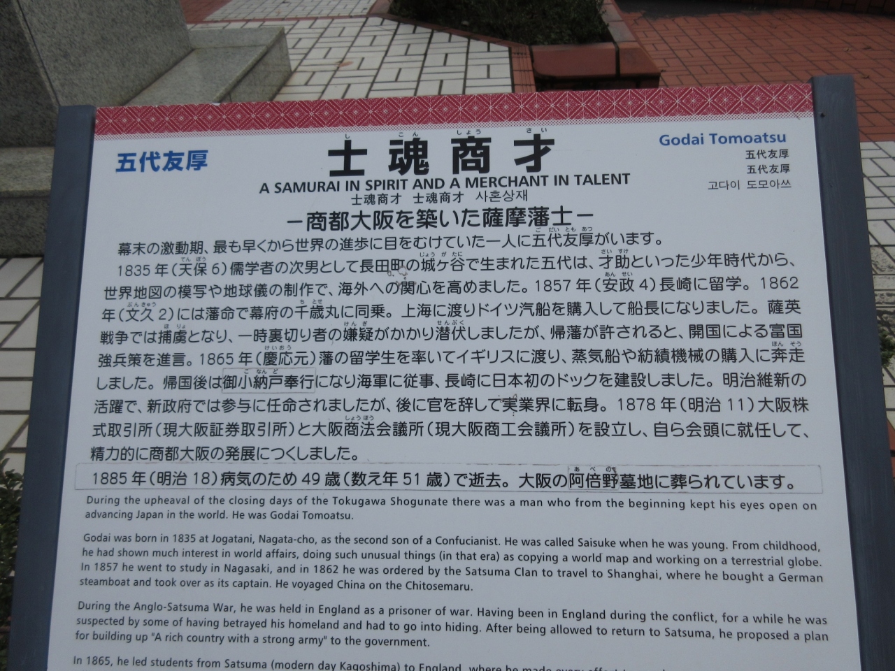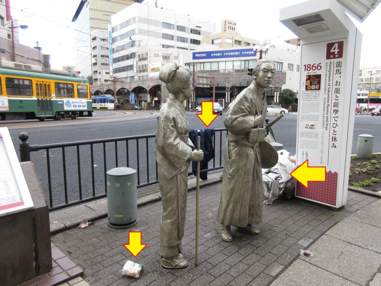「薩摩でひと休み」の記念碑ですが、その看板の裏側に、ここに住み着いているホームレスの荷物なのでしょうか、雨合羽、菓子パン、ビニール袋が 無造作に詰められている大きなリュックが置いてありました。
