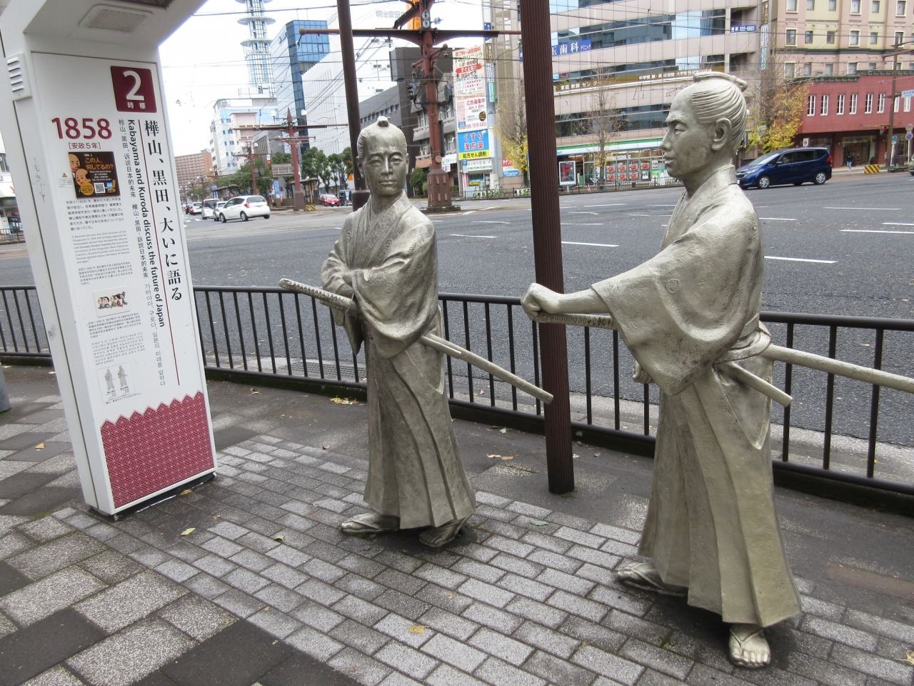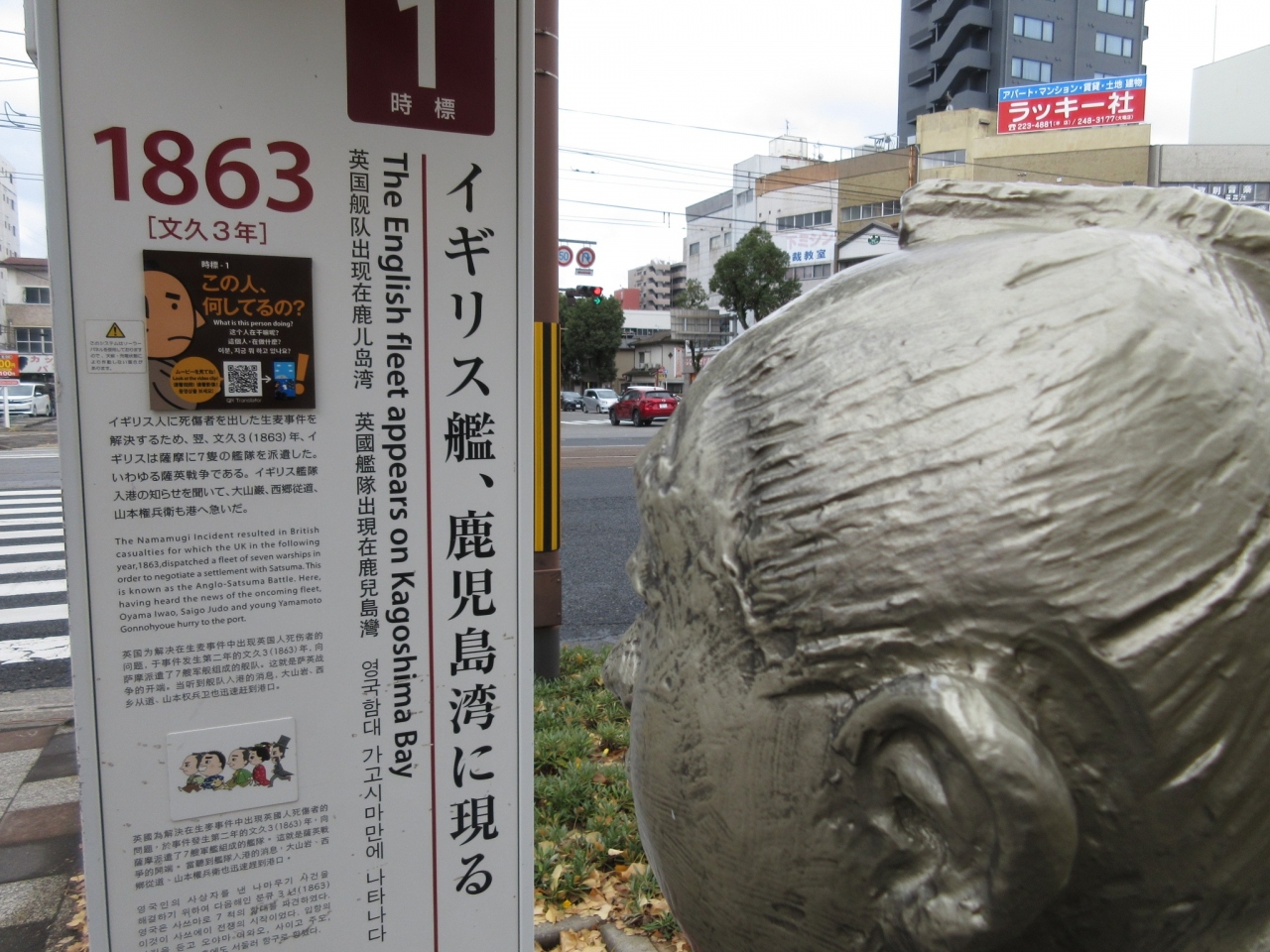 開国の5年前・1863年、鹿児島湾に現れたイギリス艦船に驚く薩摩の人たちを再現したこの銅像。