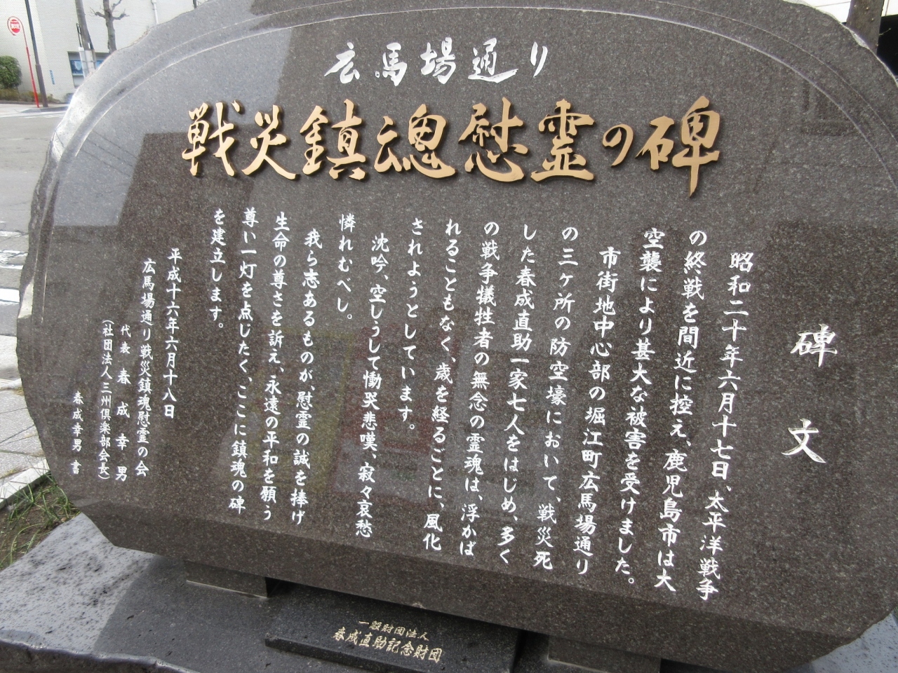 太平洋戦争の末期、昭和20年(1945年)6月17日、鹿児島大空襲で甚大な被害を被ったことを受け、永遠の平和を願い、鎮魂の碑が建立されたそうです。