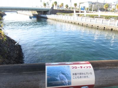 どういうことかというと、水族館に流れ込む 湾の一部をせき止め、そこで「イルカ・ショー」の練習を行っており(自由に泳いでいるだけですが…)、水族館に入らなくても イルカが自由に見学可能なんです。