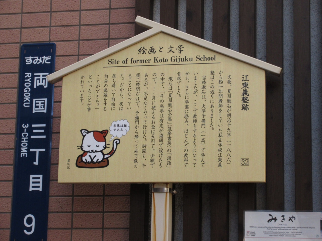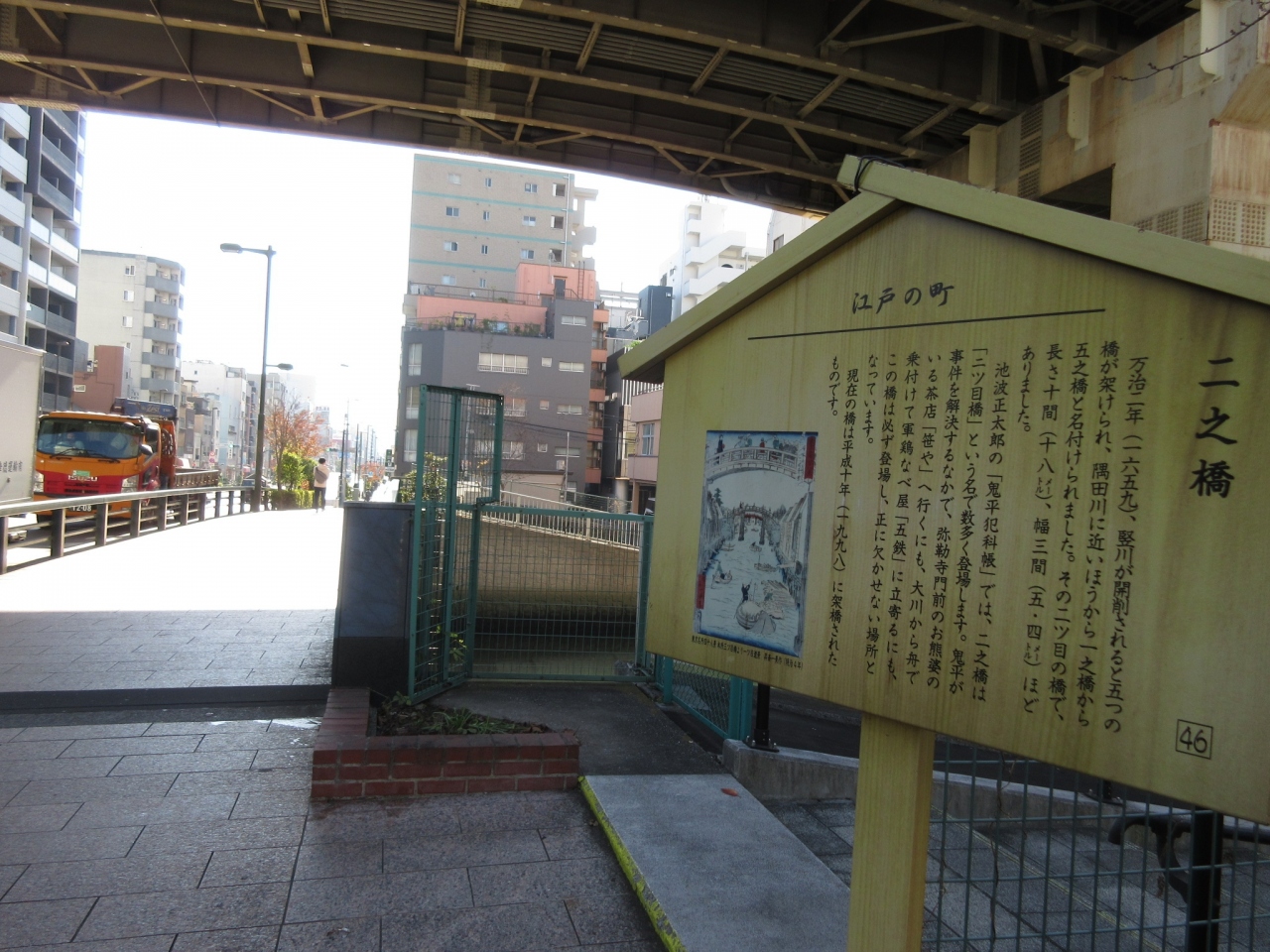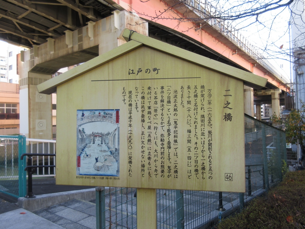 都営地下鉄・大江戸線の両国駅から 南方向へ徒歩5分ほど。首都高7号・小松川線の ほぼ真下、二之橋の北側たもとに看板が立てられています。