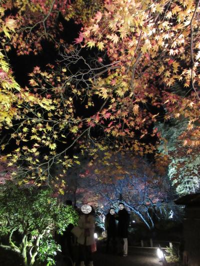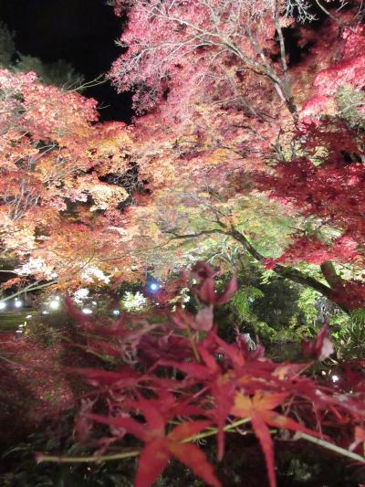 緑、赤、黄色など、色とりどりに照らされた紅葉は見事。