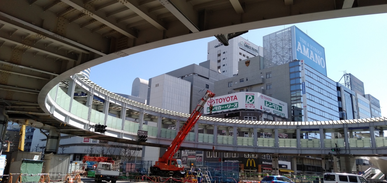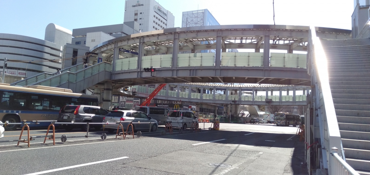 神奈川県・新横浜駅の北口にある、なんとも変わった形、というより、実に目立つ形の「歩道橋」があります。