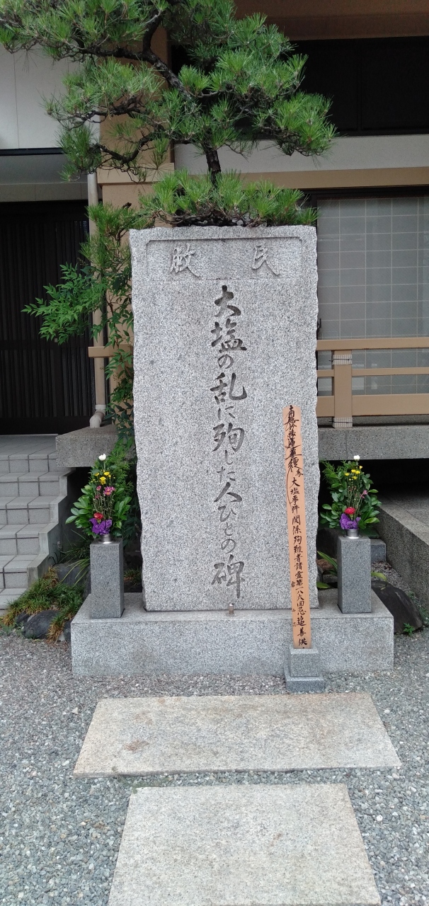 せっかくなので境内に入ると「大塩の乱に殉した人びとの碑」と刻まれた大きな石碑があり、その前にある卒塔婆には「186回忌」と書かれていました。