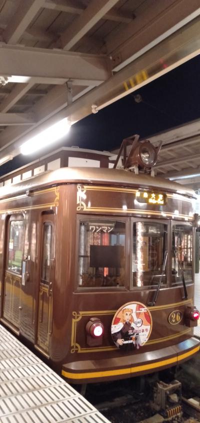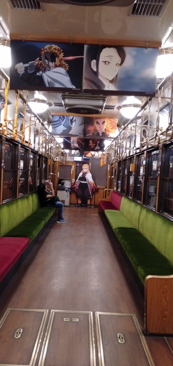 この嵐電は、アニメやドラマなどとコラボし、さまざまなラッピング列車を走らせていますが、今回は「鬼滅の刃」とコラボした「無限列車」に運よく乗れました。