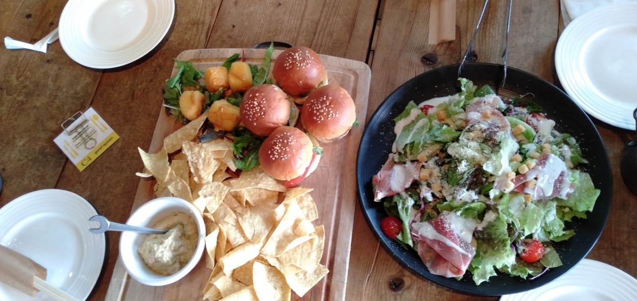 「肉」「野菜」「ハンバーガー(小さめ)」などが盛りだくさんのコース料理と、飲み放題のビールで大満足。