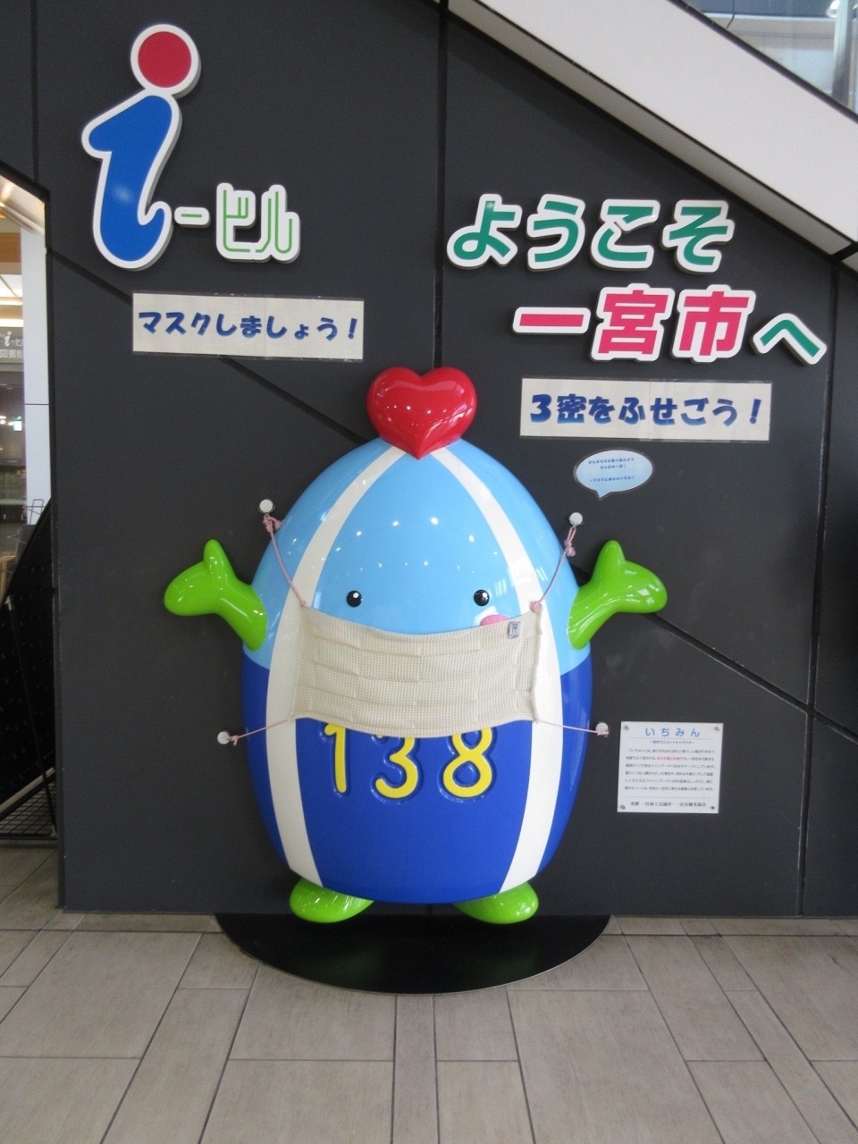 入口では、一宮市のゆるキャラ「いちみん」が、マスク姿で出迎えてくれます。- 旅行時期