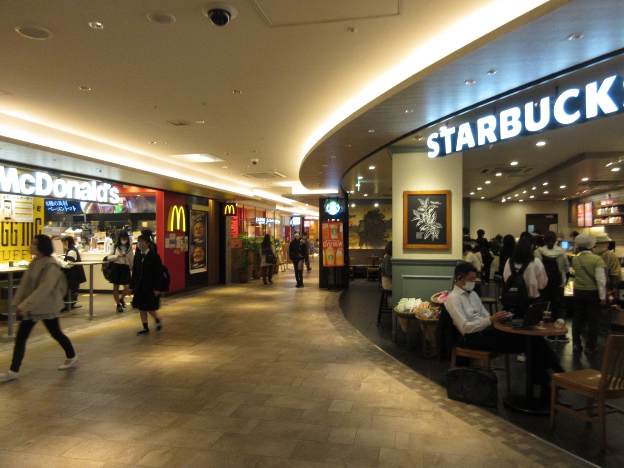 「マクドナルド」「スターバックス」などの有名チェーン店はもちろん、名古屋名物・あんかけスパゲティの店「ciao」や、福岡・もつ鍋「やまや」も出店しており、電車の待ち時間などに、サクッと利用できます。