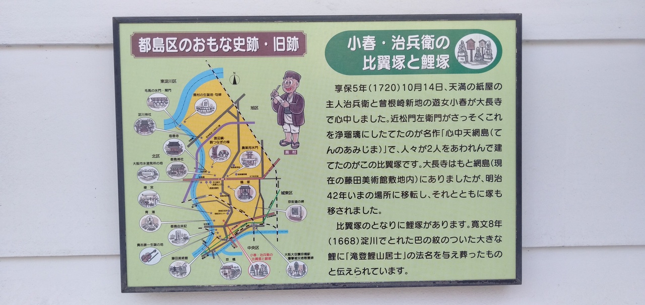 その境内に、近松門左衛門・作の人形浄瑠璃「心中 天の網島」(しんじゅう てんのあみじま)で知られる、小春と紙屋治兵衛の比翼塚があるようですが、、、