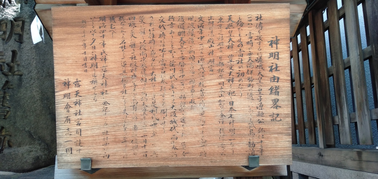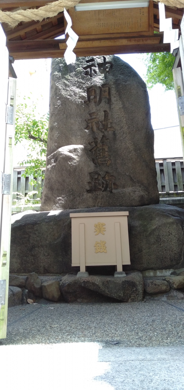 1909(明治42)年の北の大火で社殿が焼失し、現在は露天神社に合祀され、鳥居と賽銭箱と、玉垣で囲われた中に「神明社舊跡(きゅうせき)」と刻まれた「巨石」が立っているだけですが、その石の大きさには圧倒されます。- 旅行時期