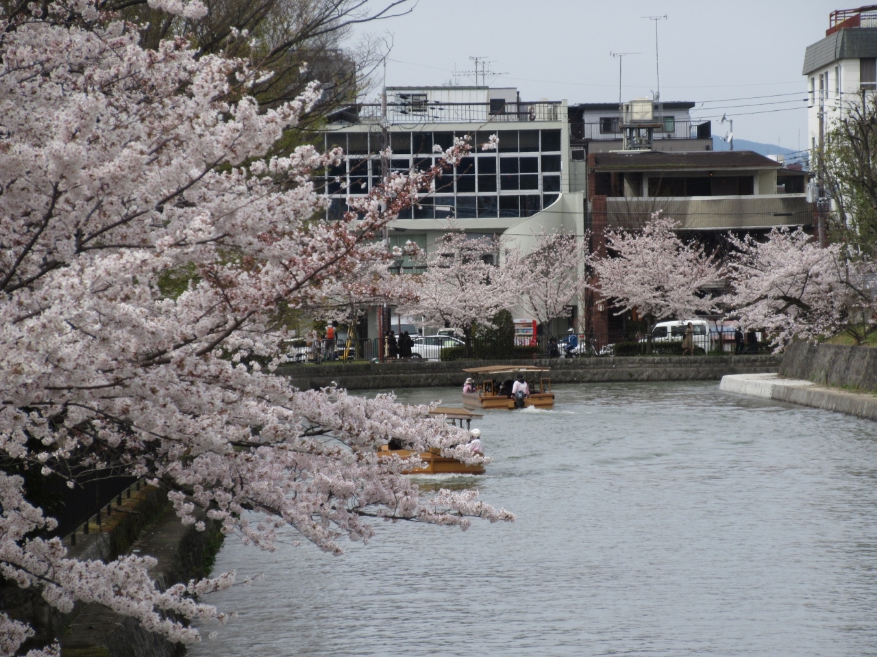 平安神宮の脇を流れる疎水沿いには、春になると「ソメイヨシノ」が咲き誇り、観光客の目を楽しませてくれます。4月上旬、まさに「満開」の桜を見物しにいきましたが、疎水にせり出すように咲き誇る様は「見事」の一言。