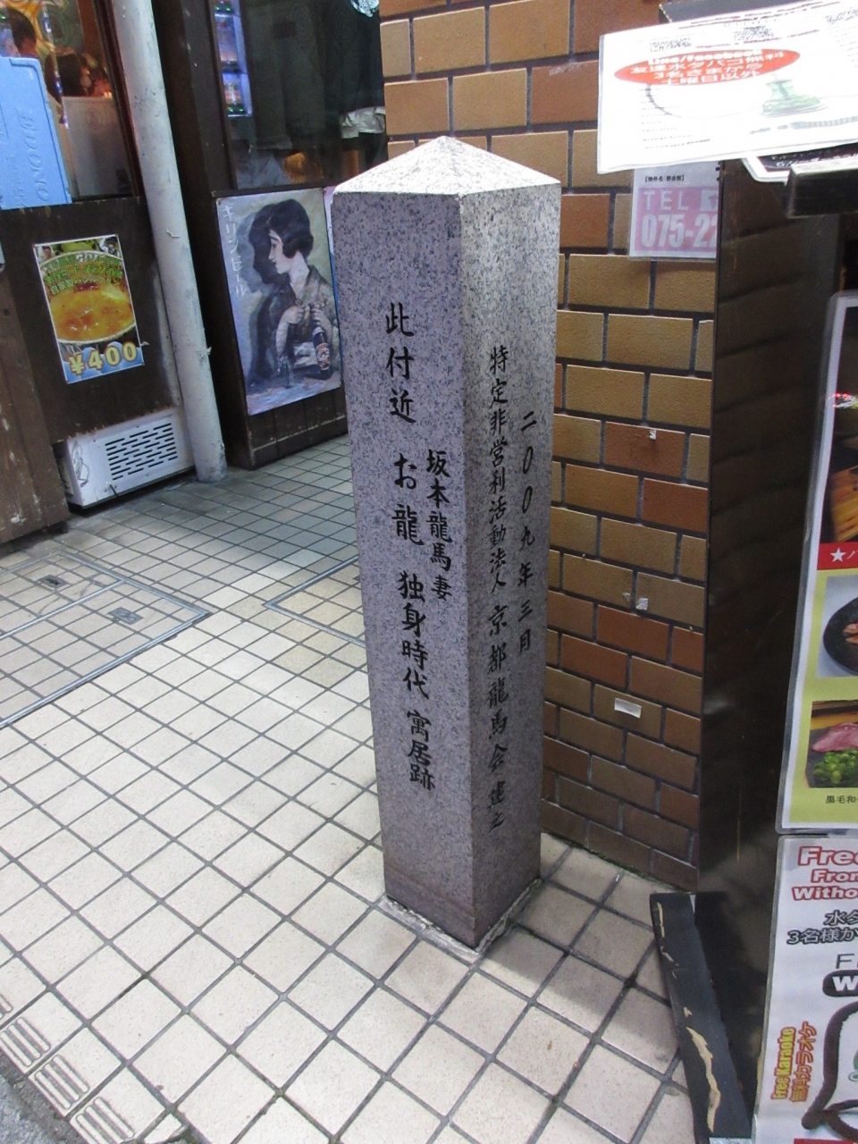 京都・木屋幕末ファンに人気を誇る「坂本龍馬」の妻・お龍が独身時代に暮らした住居の跡地らしいのですが、今では「小さな石碑」が、京都・木屋町「高瀬川」沿い、ネオンが輝く「飲み屋街」の真ん中に、ひっそりと「埋もれるように」立つのみ。。。