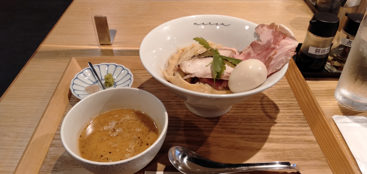 ゆで卵と大きな肉と大きなメンマが乗った「魚介鶏白湯と杉桶仕込み醤油の昆布水つけそば」を注文しました。(商品名が長い!)