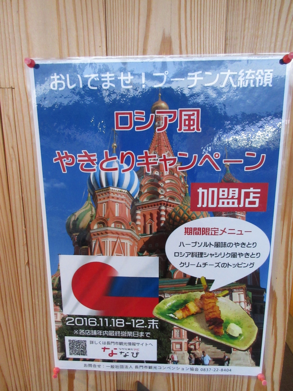 メインは焼き鳥で、オーソドックスな「ねぎま」「つくね」「かわ」はもちろんですが、お邪魔した時は日露首脳会談の前だったので、ロシアの焼き鳥「シャシリク」をイメージしたバージョンも売っていました。