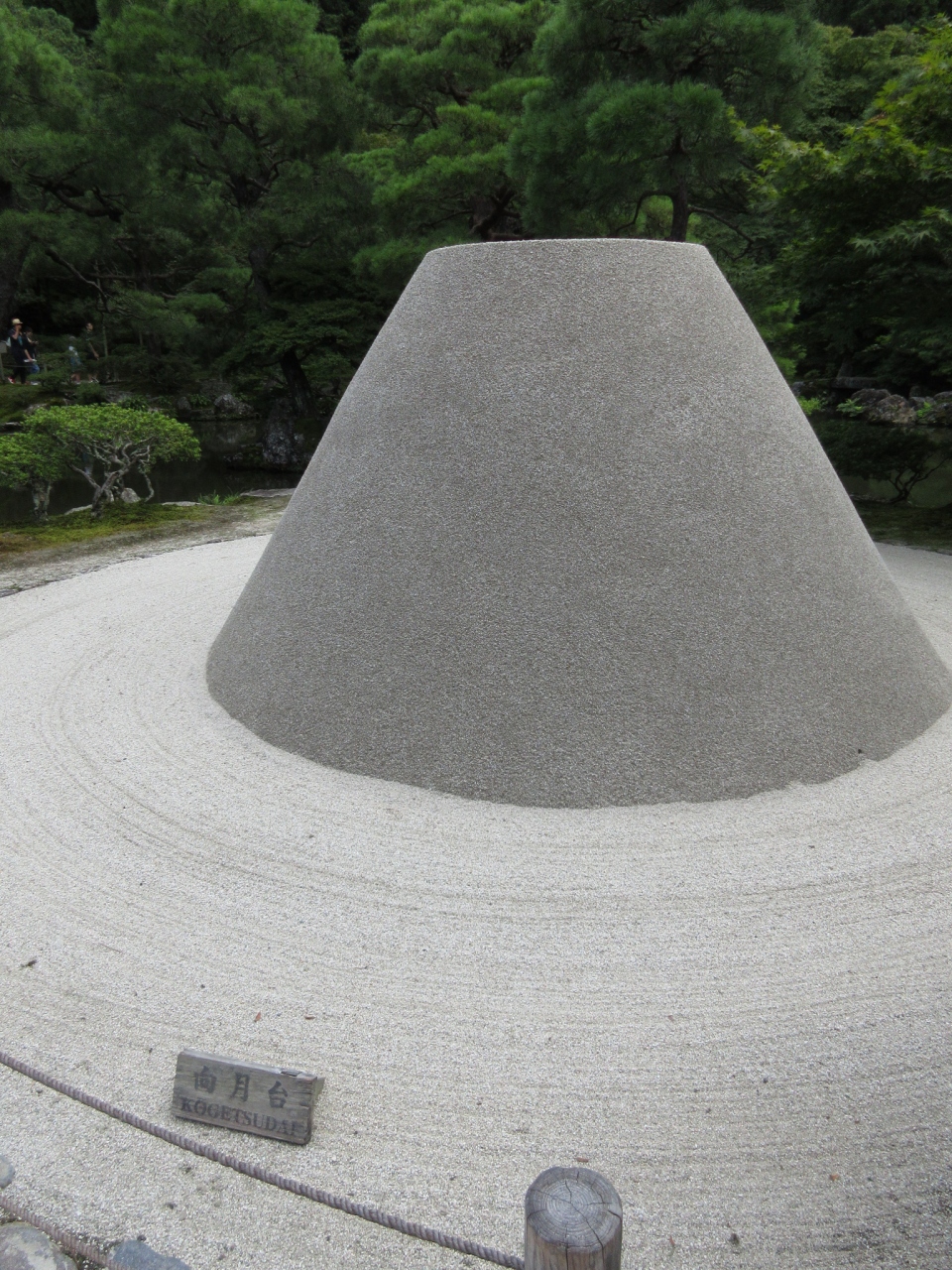 銀閣寺の山内(境内)を入って、すぐの場所にあるのが、(表現は悪いですが)プリンのような形をした「向月台」と、その目の前に広がる砂の文様「銀沙灘」