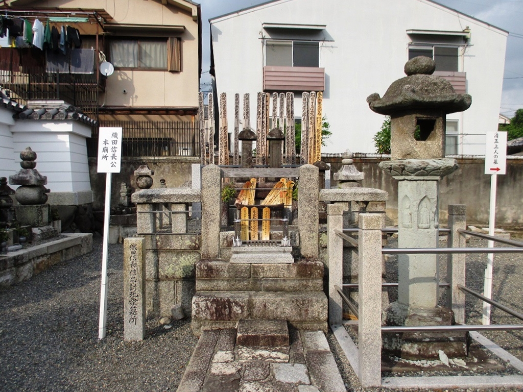 「本能寺の変」の折、織田家と親交があった 開祖・清玉上人が、信長、信忠父子及び、家臣百有余名の遺骸を埋葬したといわれる。