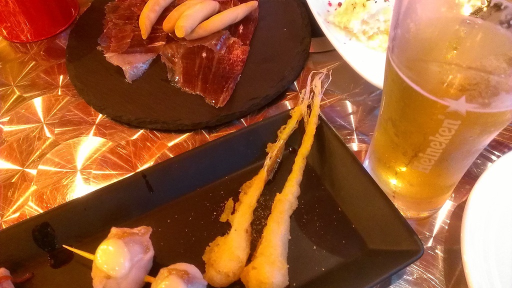各種串焼き、生ハム、ネギ揚げをおつまみに、ビール、ワインが進みます。- 旅行時期