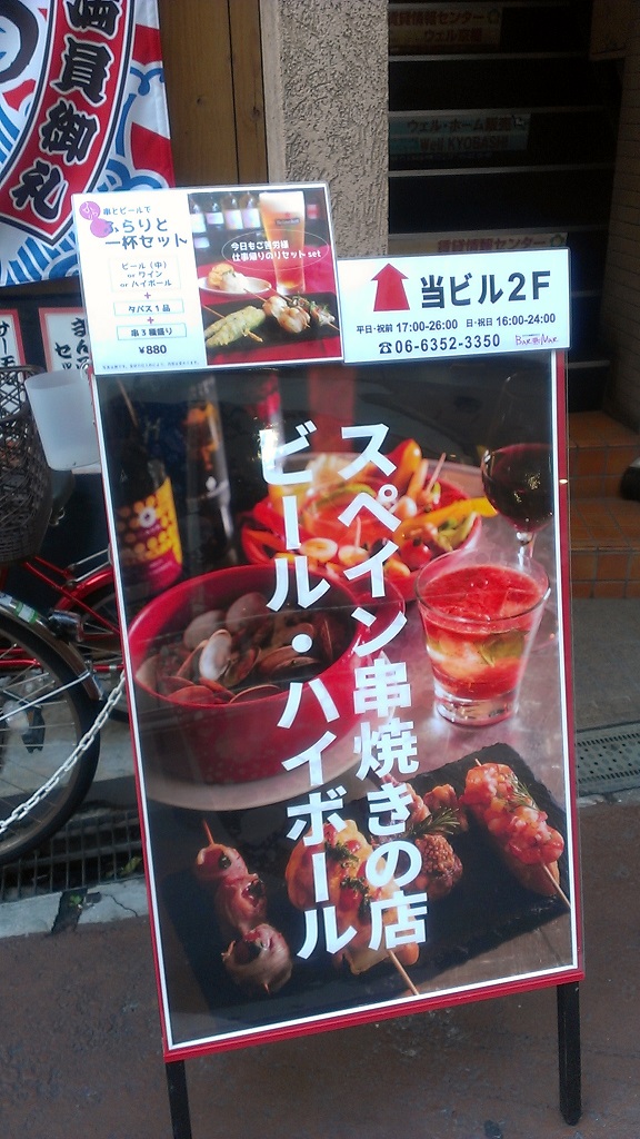 京阪電車・京橋駅下車すぐ。高架沿いのビル2階にある「スペイン・串焼き」のお店です。