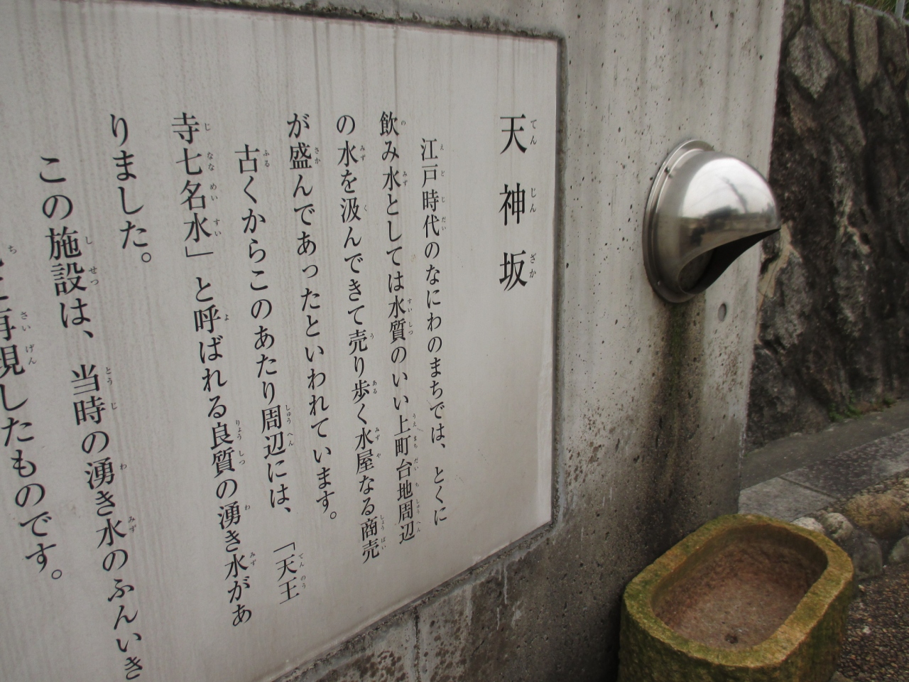 真田幸村が戦死した場所としても有名ですが、その神社の裏手にあった天神坂では、江戸時代、良質の飲み水が汲めると人気だった「天王寺七名水」が湧いていたそうです。