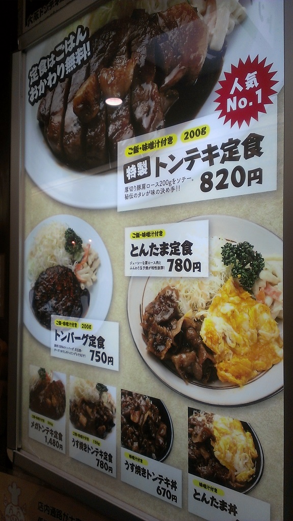 看板メニューは、ごはん(おかわり自由)、味噌汁つき、200gの「トンテキ定食」