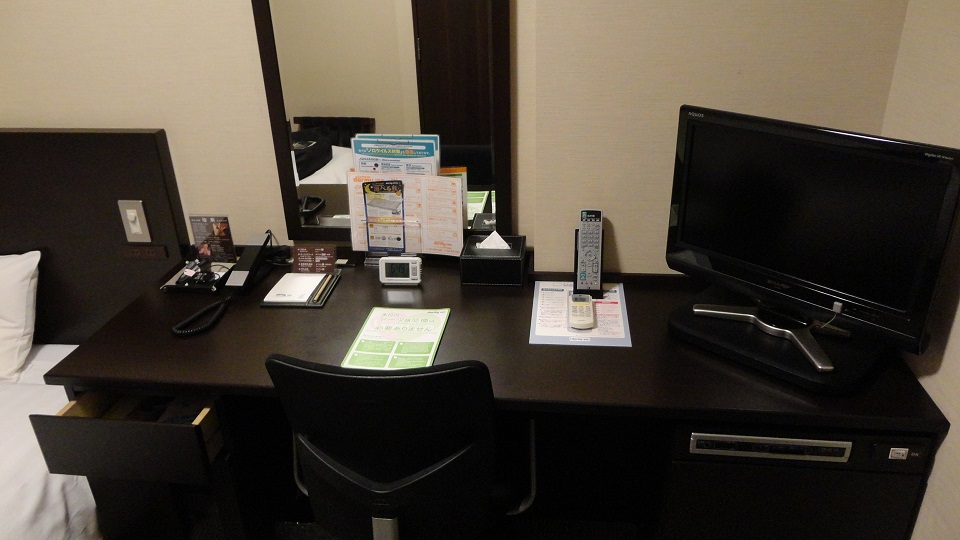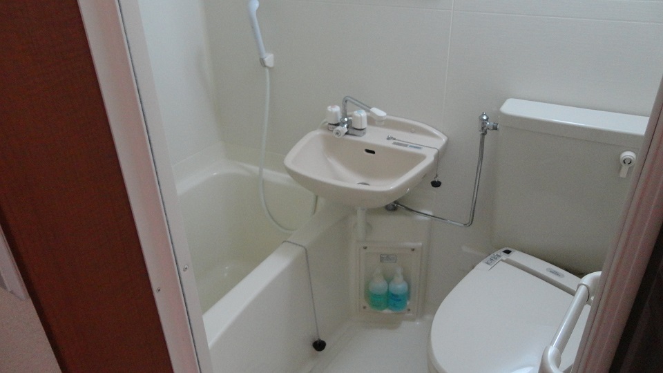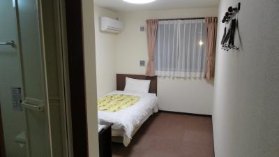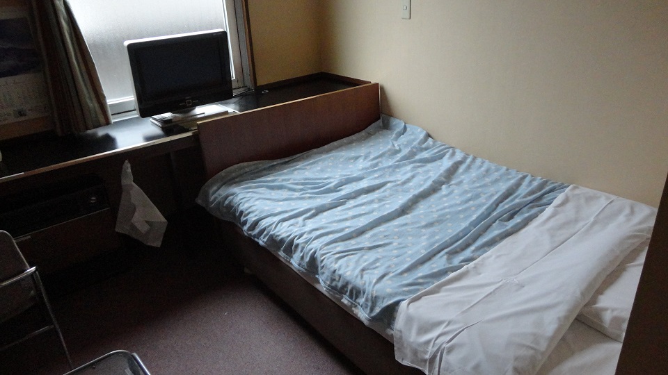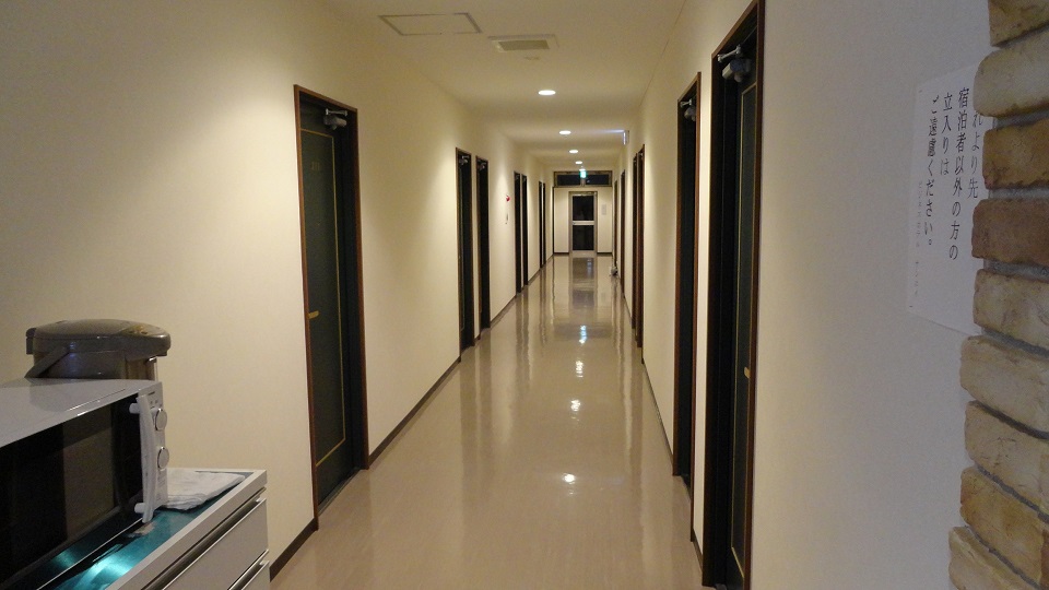 せまい室内は非常に簡素で、薄い壁が際立つ安普請な作りから想像するに、「除染」や「建築」などに従事する作業員の方々が長期で利用しているような感じです。