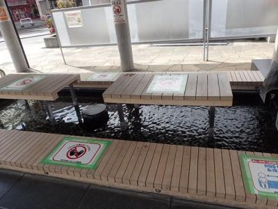 JR石和温泉駅前のロータリーにあります(駅を背にして右手側)。路線バスの停留所も目の前でした。乗る予定だった電車まで時間があったので、しばらく入ってみましたが、なかなか良かったです。屋根もありました。