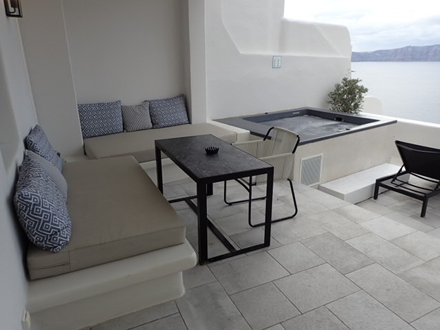 フィラのバスターミナルからそれほど遠くなく、大聖堂前の坂の階段を下ったところにあります。部屋の前のソファやジャグジーから海が良く見えました。こじんまりとしていて、スタッフも感じが良く、居心地が良かったです。