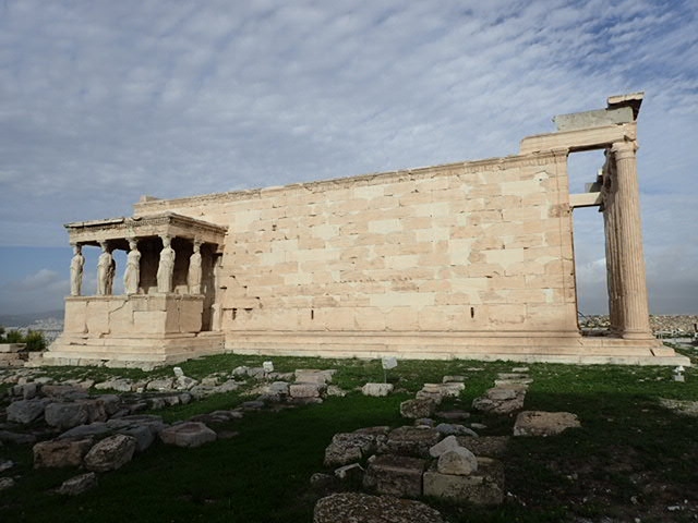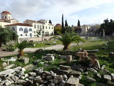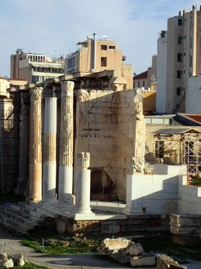 アテネの プラカ地区にあります。ローマ皇帝であったアドリアノスが2世紀頃に建てた図書館ですが、現在残っているのは、壁や柱だけです(色が違う部分は再建したところかと思われます)。結構大きな建物だったのがわかります。