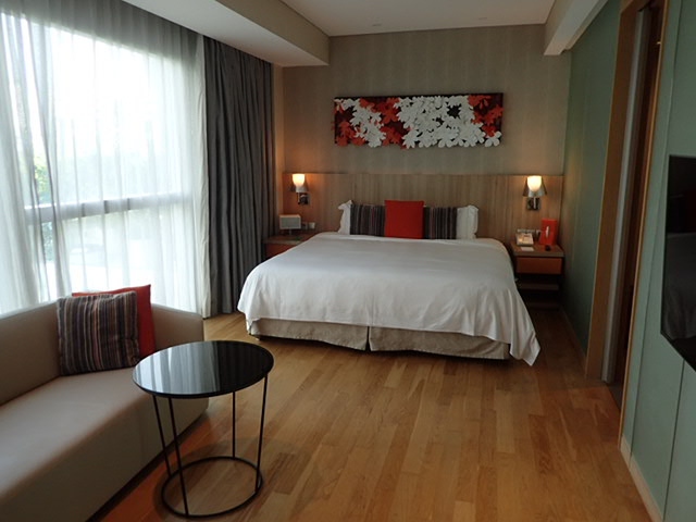 チャンギ空港からMRTで1駅と便利です。国際展示場やショッピングモールに隣接していて、飲食店やスーパーがあり、ダイソーもありました。客室はシンプルなつくりですが、広かったです。従業員は少なくて、日本でいうとビジネスホテル的だと感じました。