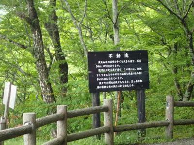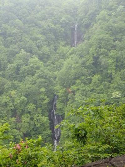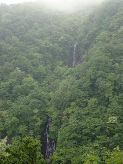 蔵王山中でもっとも規模が大きい滝だそうです。高さ53.5m、幅16m、滝つぼ32mあって、水量も多いとのこと。周囲に木がありますが、三階滝と同様に、蔵王エコーラインの滝見台から遠望することができます。