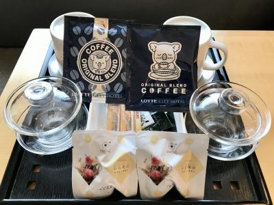 冷蔵庫にはチョコレート、緑茶ティーバックとドリップコーヒー、レディースフロア特典の花茶付きです。