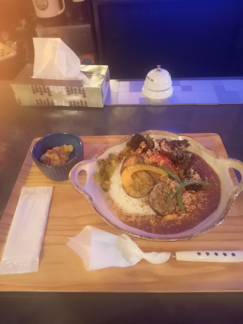 小麦粉不使用のルーカレー店。夜はカラオケバーだそうです。付け合わせにはピクルスや辛くないプチ唐辛子もありました。お肉メニューに野菜メニューあり。揚げブロッコリーはサクサクした感じで、カレーの野菜は柔らかさがあります。ルーはスパイスが効いた不思議な味わいでした。