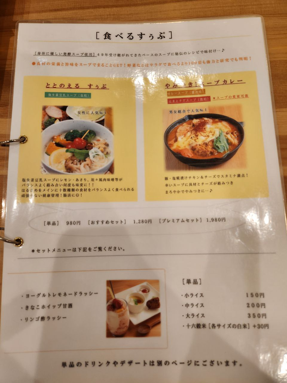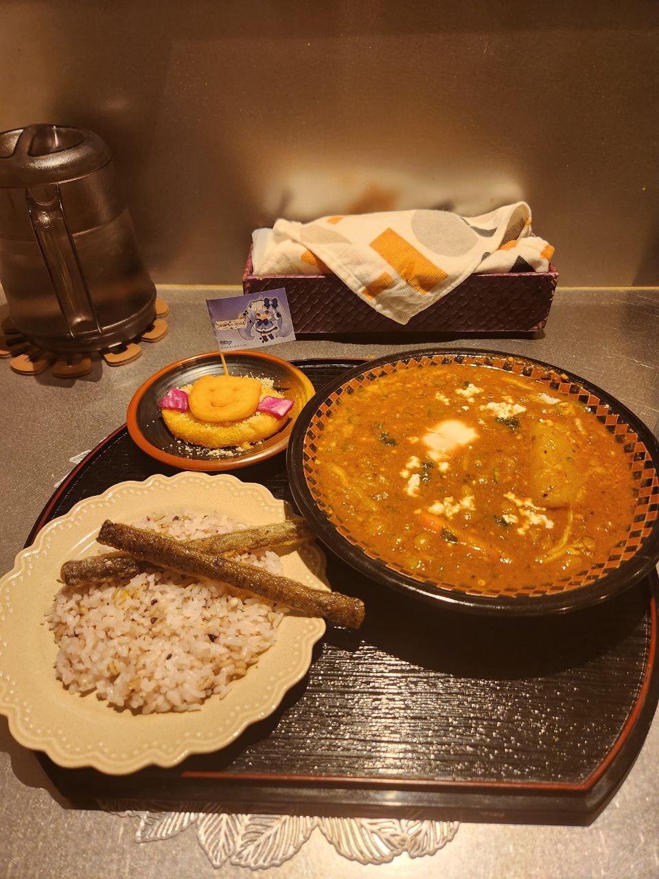 狸小路エリアのお店。発酵系の料理を扱っています。鍋物や唐揚げ定食、スープ料理などバリエーション豊富。今回はスープカレー(食べるすうぷ)を注文。ごはんはセットメニューか単品注文にて追加できます。
